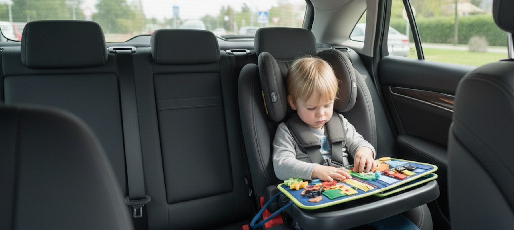 Dieses Bild zeigt, wie praktisch das Busy Book auf Reisen ist – egal ob im Auto, im Flugzeug oder im Park. Es beschäftigt Kinder sinnvoll und macht jede Fahrt entspannter für die ganze Familie.